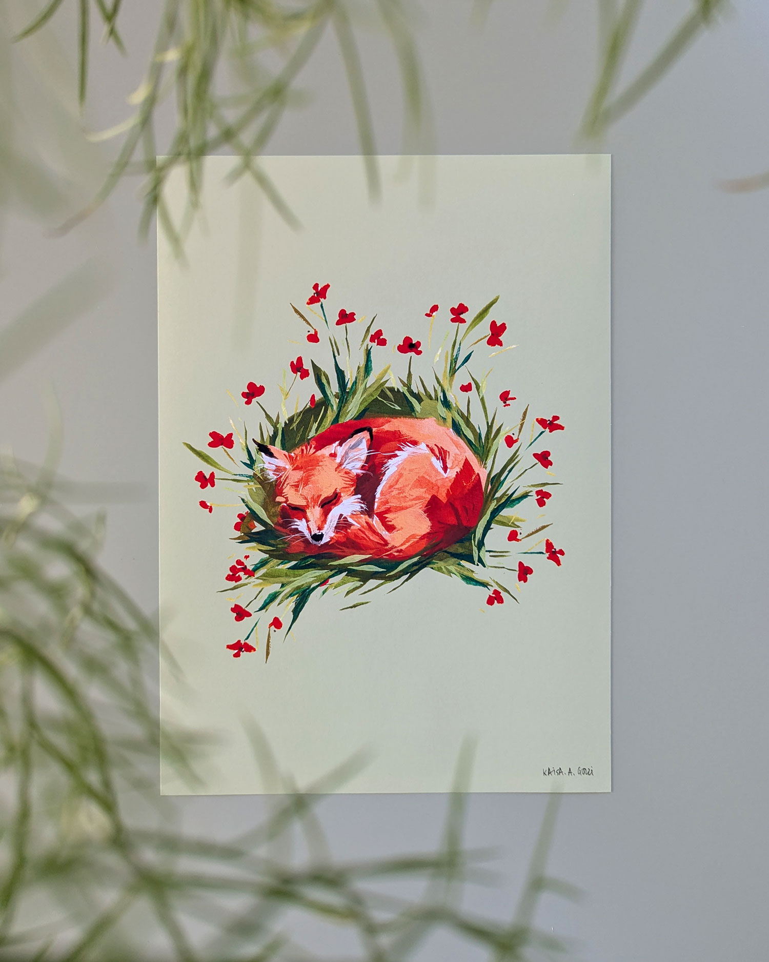 Utskrift i A4 format (210 x 297 mm) på sovande räv med grön bakgrund. Från originalmålning i akrylgouache, varsamt bearbetad digitalt. Matt fotopapper (210 gram), signerad.